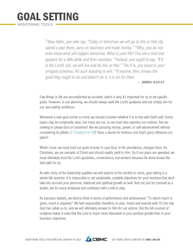 This simple devotional and goal-setting exercise can be used for oneself or in a discipleship or mentoring relationship.