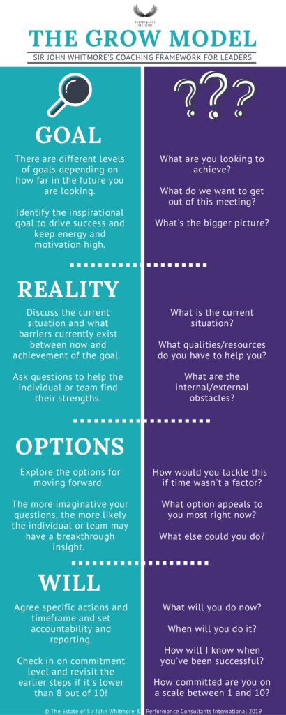 The GROW model is a widely-used framework in personal coaching for setting and achieving goals. It stands for Goal, Reality, Options, and Will. The GROW model provides a structured framework for coaching conversations, guiding individuals through a process of self-reflection, goal-setting, and action planning to achieve their desired outcomes.